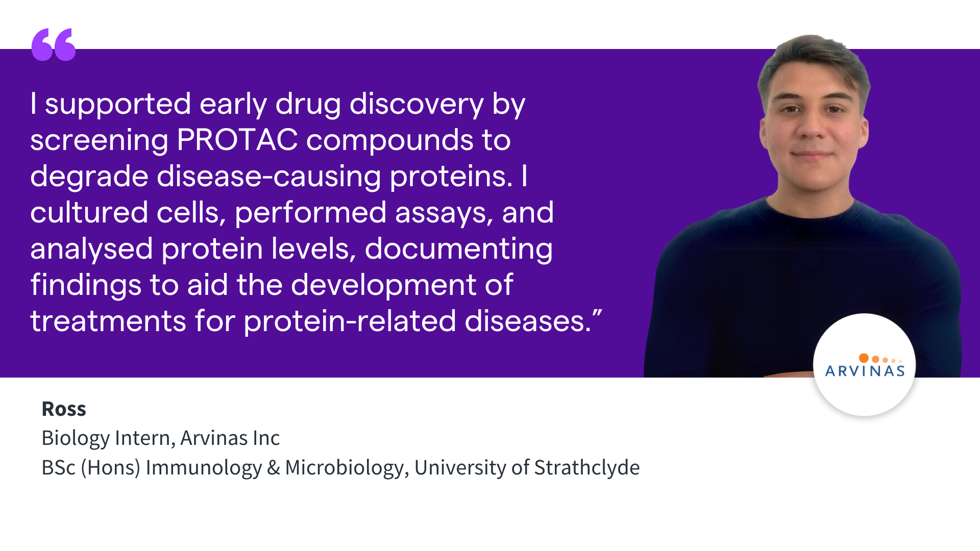 Saltire Scholar Ross joined Arvinas Inc as a Biology Intern, advancing drug discovery through cell culture, treatment protocols, and protein analysis. His work supported the development of treatments targeting disease-related proteins.